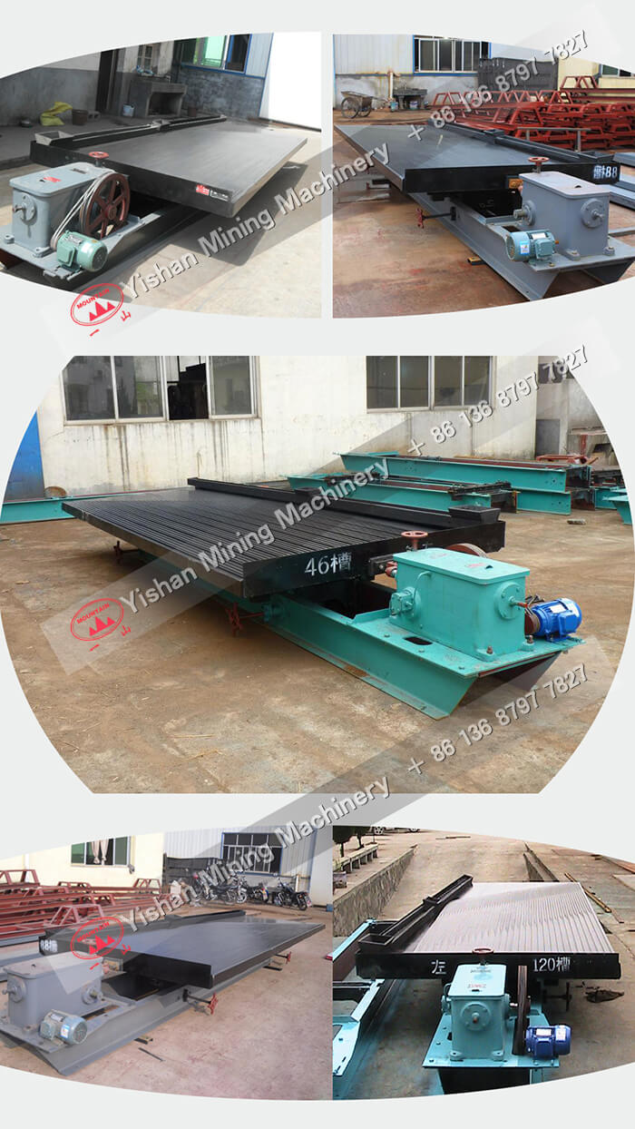 6-S選礦搖床主要由床頭、電動機、調坡器、床面、礦槽、水槽、來復條以及潤滑系統等八個部分組成。